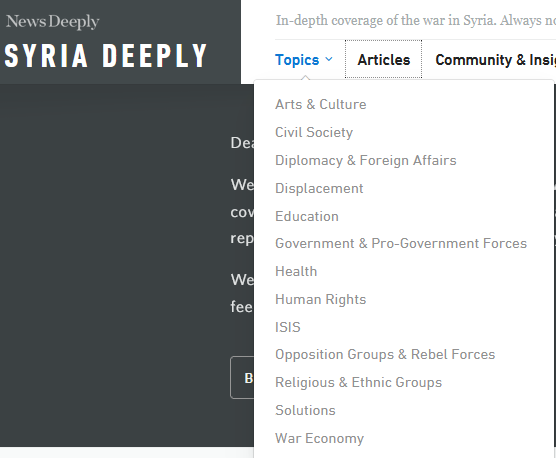 سایتی وجود دارد به نام News Deeply و بخشی دارد مختص اخبار سوریه. در این سایت دستهبندیای وجود دارد. در این تصویر تمام این دستهبندیها را میبینید.