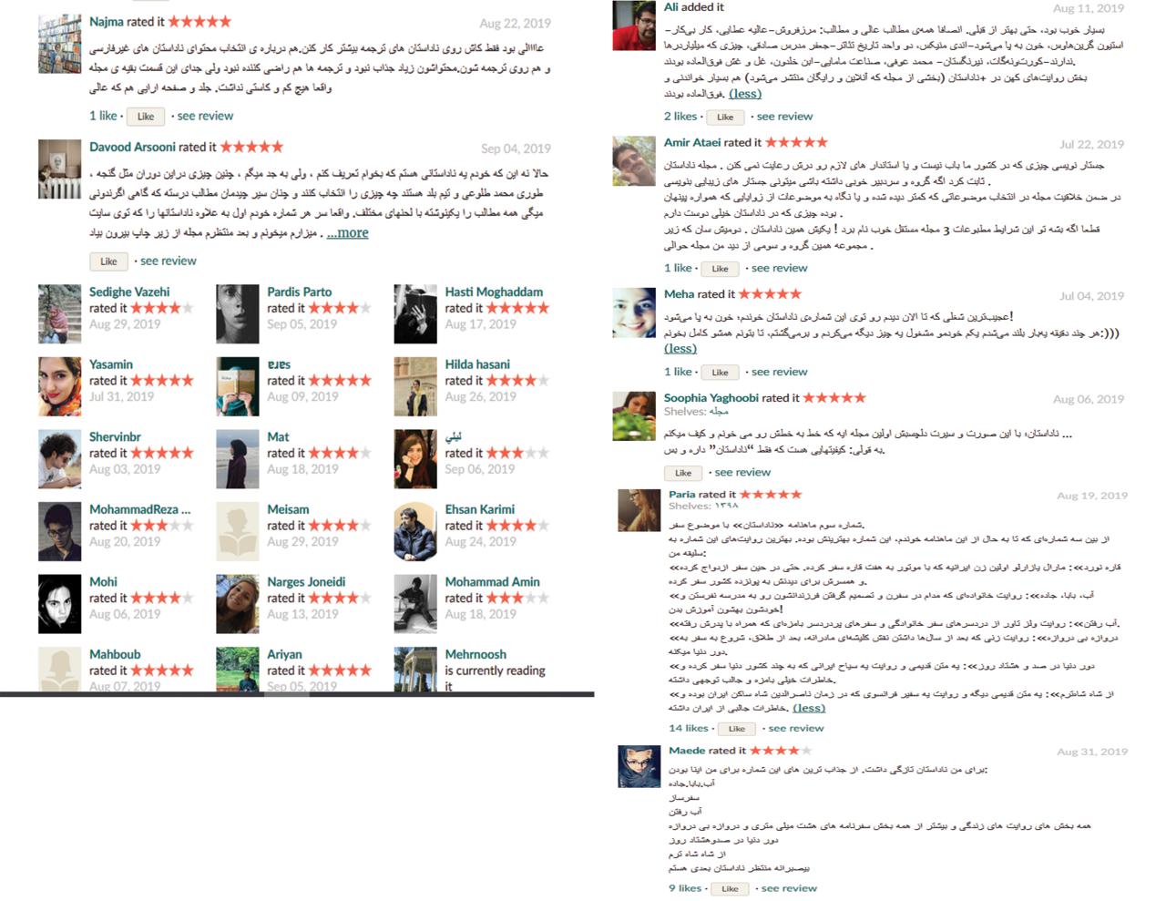 زیبایی چشم نواز خود ازعوامل عوام فریبانهای است که میشود رویش مانور داد. کسی که ماهی پنجاههزارتومان مجله میخرد و پای بیبیسی سفارش آقای مسعود بهنود را از لندن برای خواندن این مجله میگیرد، دیگر شکی ندارد که باید این مجله را در کتابخانهاش داشته باشد. این قضیه حتی پایش به سایت Goodreads هم میکشد. کسی حق ندارد در این سایت مجله را تحت عنوان «کتابی از خود» بگذارد ولی شما این مجلات را در آنجا هم میتوانید ببیند. ساختار مجلات با کتاب فرق میکنند و در این سایت جایی برای ثبت مجله نیست. اما این کار را میکنند برای اینکه نیاز به این حمایت مجازیای که در تصویر میبینید دارند.